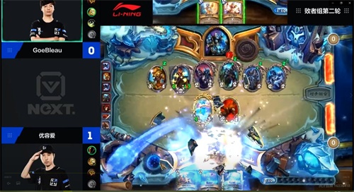 第一局比赛中,GoeBleau使用天启圣骑士迎战优容爱的奇数圣骑士,优容爱在中期利用双等级提升!打出了高额伤害,并利用虚空撕裂者成功处理了GoeBleau的嘲讽随从,GoeBleau最终缺乏解场手段,打出GG,比分来到1比0。