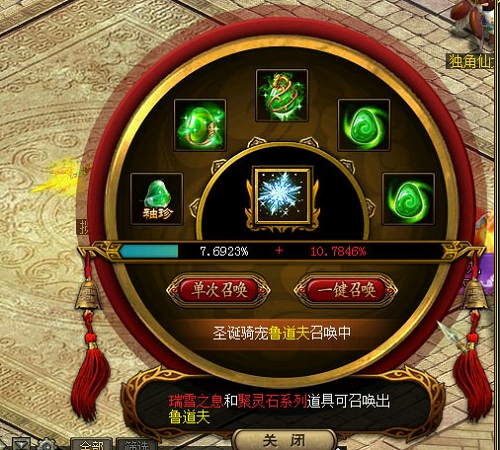 玩家可以右键点击“瑞雪之息”开启召唤鲁道夫的活动,与聚灵石系列道具一并炼化,可以增加鲁道夫的成功概率;打开该界面后提交瑞雪之息和聚灵石系列道具,需要消耗一份瑞雪之息和1~5颗聚灵石均可召唤,每次召唤有概率直接召唤成功或完成度达到100%后必定成功,召唤成功后获得全新7阶骑宠“鲁道夫”。