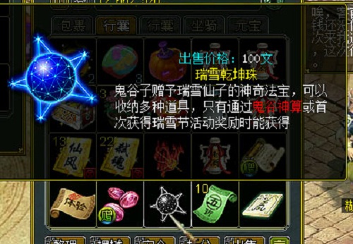此次同时开启鬼谷神算系统,玩家可通过天墉城NPC“鬼谷子”进行鬼谷神算也可获得瑞雪之息和瑞雪窗花奖励,抽取需要花费一定元宝,当玩家通过鬼谷神算系统获得道具将放入特殊道具“瑞雪乾坤珠”内或玩家第一次获得窗花奖励时也会生成此道具。
