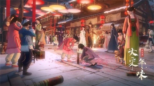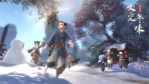 在过年这几天,如果天色将亮的时候玩家路过皇城外,可以看到百官依次进宫参与元旦朝会的场景;而汴京杭州的各处府邸民宅,也会洒扫门庭,除旧换新;正月初一的时候主城的NPC们也会相互走动,互相拜年。大人小孩在街巷中燃放爆竹。游戏的建筑物上,会有灯笼、桃符、门神、旗幌等装饰。而汴京与杭州两处主城,根据天气变化,还会实时下满及膝大雪。