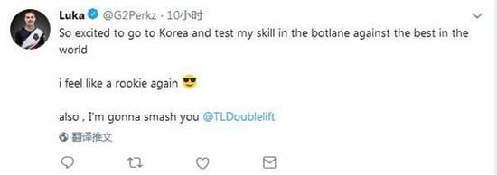 “很高兴能去韩国和世界上最强的下路选手们切磋提高自己,我感觉我又变成了一个弟弟,不过我打你还是足够了@Doublelift”