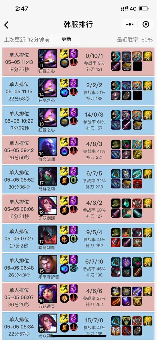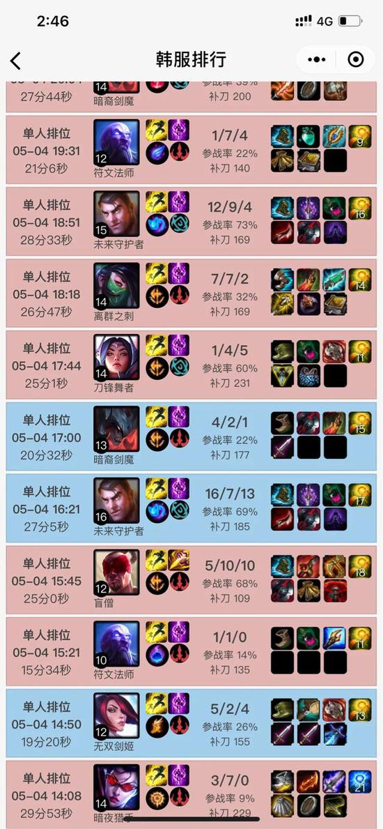 我查看了一下TheShy近期韩服排位记录,我发现这个人真的是个怪物,他从5月4号的下午2点一直打游戏打到5月5号中午12点,其中有27把排位赛,3把大乱斗,总共玩了30把游戏,中间只休息了4个小时不到,不知道是吃饭睡觉还是去打训练赛了。