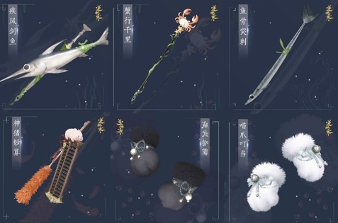 铁衣放下了拳套,穿上喵喵肉垫开始聚怪,碎梦、龙吟两个流派曾经用来放大招的刀和剑换成了秋刀鱼,血河曾经锃光瓦亮的枪上活灵活现的装了一只大螃蟹……官方还给这些武器挨个取名,“威武喵霸”、“鱼骨突刺”、“疾风剑鱼”,这些名字配合着憨态可掬的流派武器,让《逆水寒》从上线开始就营造的古风武侠氛围,变成了童趣十足的动画片风格。