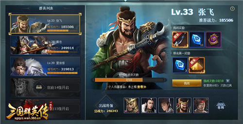 三国中实力辈出的武将不在少数,即便是稍有名气的武将在对抗他们时都会败下阵来,更何况兵力不足的主公非要当枪匹马战枭雄,为此,百战群英专门设定了全民挑战的玩法,所有主公可同时上阵对多个等级的将领发起挑战,每个将领被挑战10次后即被击败,一段时间后将重生,再次迎接主公的挑战。