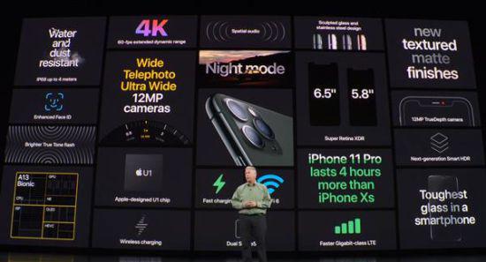 iPhone 11 Pro及iPhone Pro Max手机,分别配备了5.8寸、6.5寸OELD屏幕,升级了三摄拍照,售价999、1099美元起,跟去年的价格一样。