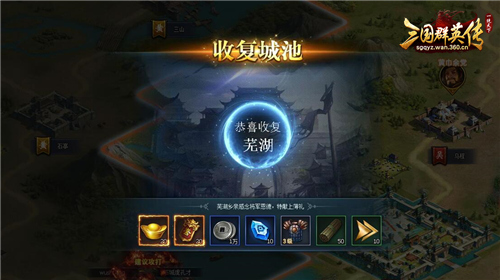 收复城池除了可以扩大国土面积,更重要的一方面是可以获得海量资源和钱财,包括元宝、铜币、强化石、装备、兵书等等,算得上是玩家集合资源最有效的途径。