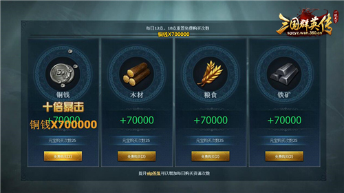 玩家个人封地的市场里可以免费领取铜钱、木材、粮食、铁矿四种材料,提供的量不算少,每天12点、18点重置免费购买次数,提升VIP等级可以增加每日购买资源次数,幸运的话还能得到“五倍暴击”、“十倍暴击”等翻倍福利!