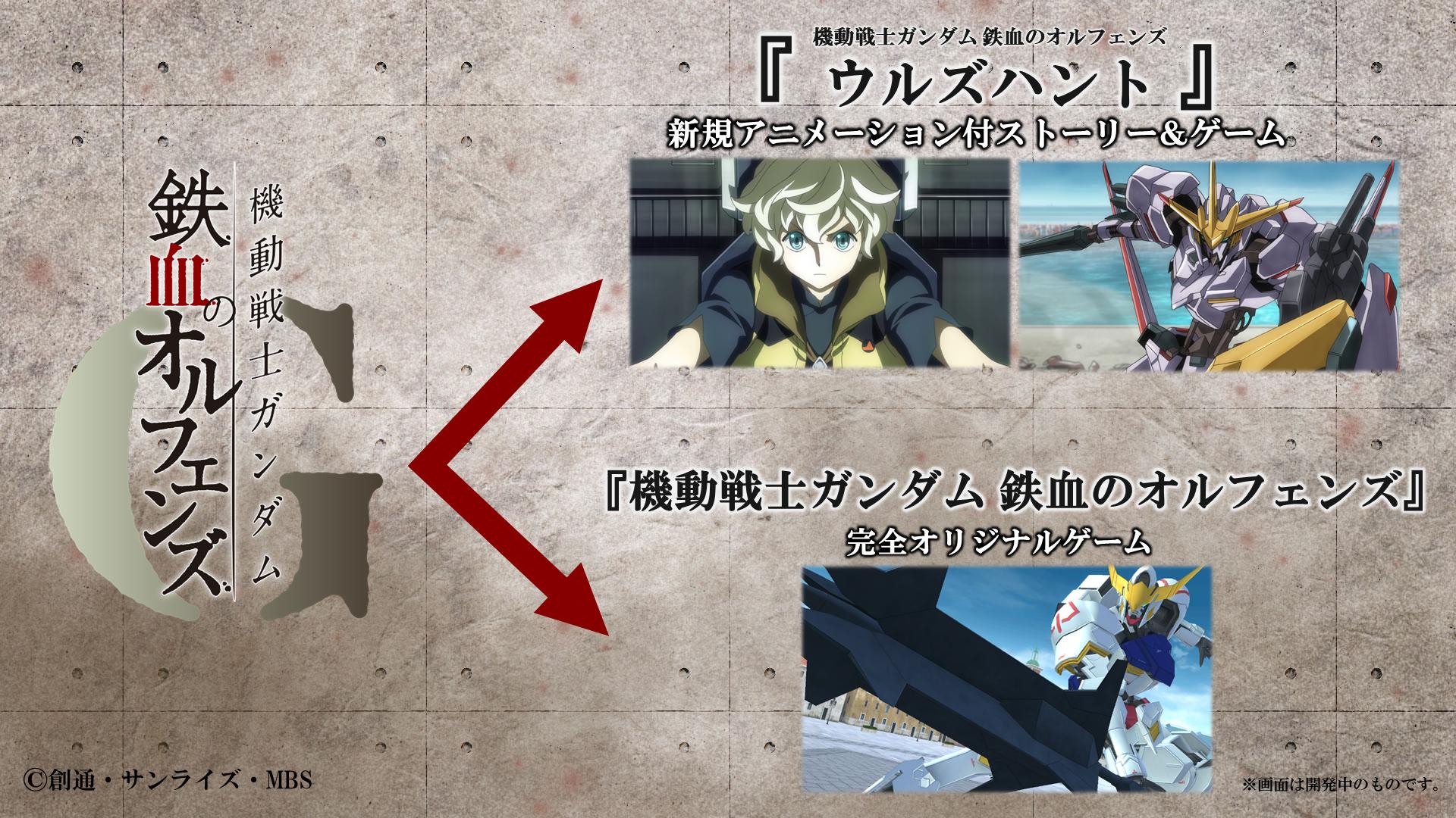 《机动战士高达 铁血孤儿 狩猎乌尔德》方面除了游戏外还会在手机程式中收录作品的故事剧情动画,而动画的剧情总量会超过电视动画的一个季度。另外,官方同时公开了 2 名新角色与机体,可惜暂时未能透露角色的背景与详细内容。不过官方表示会在今年年尾左右时间再公开游戏的新消息,而今次的舞台上展示了动画的新 PV,加入了一些宇宙战的场景。
