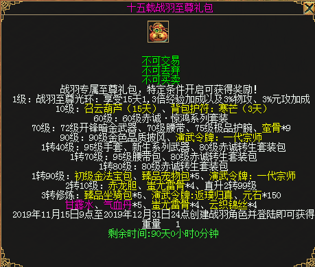 全新的福利--战羽至尊礼包(绑定)是单为新职业所准备的。除当月新服外的所有服务器玩家,活动期间使用新职业角色上线即可领取“战羽至尊礼包”(绑定),达到对应级别右键使用礼包可以获得对应物品。武器、各式念珠以及其他大量冲级必备物资样样俱全,让您在老区也能快速玩转新职业!