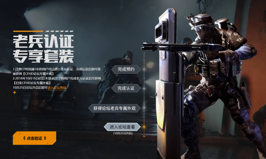 同时,CFHD也为征战CF多年的老兵们,准备了相应的回归奖励!CF注册时间满1年的玩家,以及从2018年10月15日后未曾登录过CF的玩家,在完成老兵认证后可获得相应的CFHD论坛专属外观。