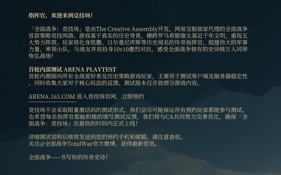 玩家现在即可前往官网arena.163.com进行预约,测试信息将会通过预约手机及邮箱发送。测试过程中的游戏体验也可以随时通过问卷调查等渠道及时反馈,网易将与CA一同完善优化,尽快将《全面战争:竞技场》带给中国玩家!