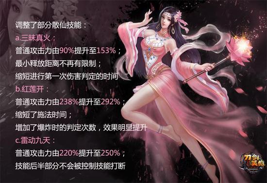 散仙有三个技能作出了大幅调整,其中三昧真火除了最小释放距离不再有限制,缩短进行第一次伤害判定的时间外,普通攻击力由90%提升至153%,得到了大幅提升。红莲开缩短了施法时间,极大的提高了生存能力,并且在爆炸时增加了伤害次数,由原来的1-2次伤害,提升到3-4次,攻击力也由238%提升至292%,可谓效果明显。雷动九天调整了后半部分不会被控制技能打断,攻击力也由220%提升至250%。玩了这么久的仙,再次迎来了春天!(图中数值均为最高等级)