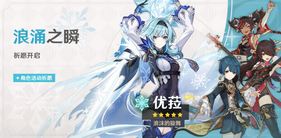《原神》‘浪涌之瞬’活动祈愿已于5月18日18:00开启,限定五星角色‘浪沫的旋舞·优菈(冰)’的祈愿获取概率提升。