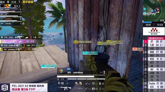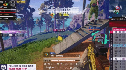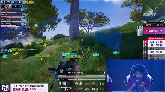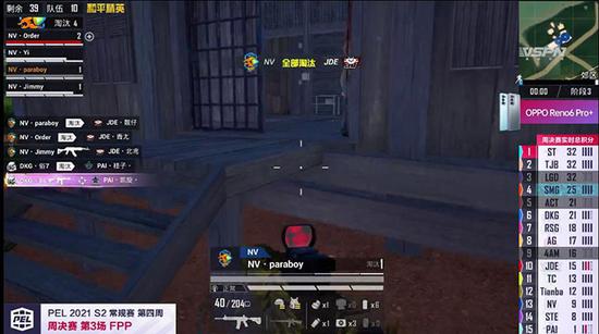 在PEL 2021 S2赛季第四周周决赛第三场比赛中,NV·Order在遗迹附近与JDE骁龙战队相遇,虽然JDE骁龙战队有四个人在附近,不过在最前面的NV·Order稳扎稳打,扔出两个雷将JDE·竞争炸倒。在对方队友拉起JDE·竞争期间,NV·Order不断寻找位置,主动出击,最终在其队友拉起来之前将其淘汰。与此同时,NV·Paraboy在郊区的巨石后面,远距离三倍镜将路过的两名敌人击倒,再一次证明了伞兵的远战实力。