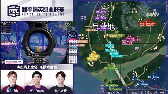 决赛圈阶段,ST、RSG和NV-腾讯视频战队展开混战,房屋中的RSG·Quan选手首先被NV·Order炸倒击杀,NV·Paraboy带领队员压上,随后RSG·闪电也被NV·Order击倒,但被SMG·pickfeet补掉。架后点的NV·Jimmy在交战中被RSG·盒酱击倒,SMG·Beautiful抓住机会将NV·Jimmy补掉。在两面受敌的情况下,NV·Paraboy守住点位,补掉ST·帅狗,帮助NV·Yi拿到淘汰。