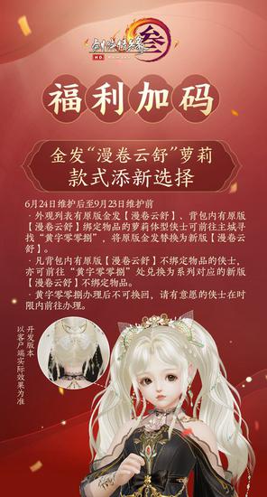 值得一提的是,6月24日维护后至9月23日维护前,外观列表有原版金发[漫卷云舒]、背包内有原版[漫卷云舒]绑定物品的萝莉体型侠士可前往主城寻找“黄字零零捌”,将原版金发替换为新版[漫卷云舒]。凡背包内有原版[漫卷云舒]不绑定物品的侠士,亦可前往“黄字零零捌”处兑换为系列对应的新版[漫卷云舒]不绑定物品。黄字零零捌办理后不可换回,请有意愿的侠士在时限内前往办理。