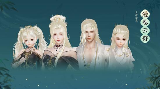 云舒云卷,静看花开,全新金发“漫卷云舒”引领时尚新潮!成男款披发微卷,流光缱绻,给人以温柔宁静之感。成女款以金饰挽发,形若璨莲,薄纱作缀,更具圣洁之意。萝莉款以双马尾配硬纱透饰,懵懂可爱,萌动你心!正太款编发柔顺,更有精美金饰点缀,彰显雅致!不仅发式贵气精致,侠士们还可享受专属折扣券抵扣3,000通宝的优惠!