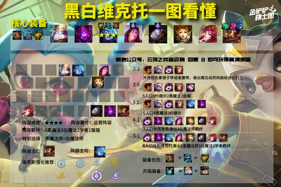 想要玩好黑白魔法师阵容,前期一定要做好薇古丝的装备,2星薇古丝搭配神装就非常容易过渡到8人口,但是如果前期只去做法师的装备,前排没有坦度就非常容易暴毙。因此小嗨还是建议大家开局可以考虑锁子甲、腰带、魔抗这些防御装开局,在高黑魔法师羁绊加成下,每个黑魔英雄都有非常不错的伤害。