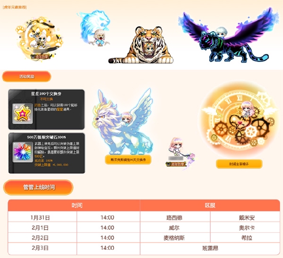 虎年之旺落谁家?虎年福袋告诉你答案。2月3日~2月6日,每天下午14点~15点,管理员将在射手村召唤集财运和幸运为一体的虎年福袋,打爆它将有机会获得金币、骑宠、伤害皮肤、椅子等虎年好礼。同时,管理员还将为前往现场打福袋的玩家施展强力buff,助你经验up、战斗力up!