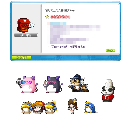 1月12日起至4月5日,玩家可以接取[冒险岛互动播]大明星就是你任务,进入互动演播室,成为节目创作者,亲自制作节目与演出,和品克缤一起成为冒险岛互动播超级巨星!