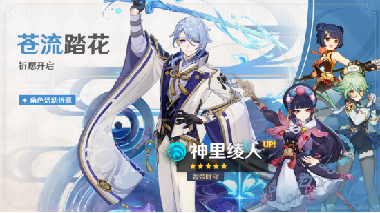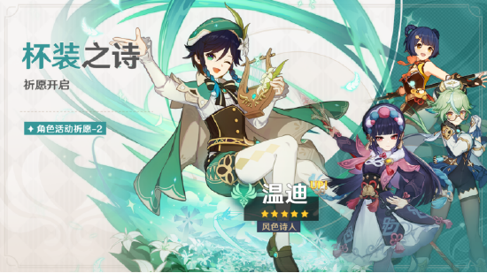 2.6版本更新后至2022年4月19日17:59,角色活动祈愿「苍流踏花」和角色活动祈愿-2「杯装之诗」开启,全新限定五星角色「磐祭叶守·神里绫人(水)」和限定五星角色「风色诗人·温迪(风)」迎来概率UP。