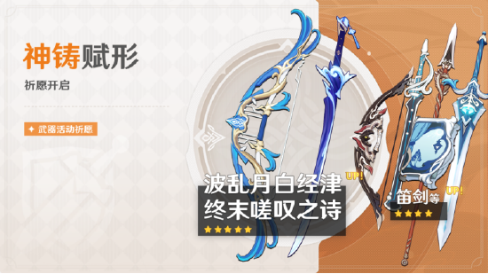 除此之外,神铸赋形祈愿也已开启。全新限定五星武器「单手剑·波乱月白经津」、限定五星武器「弓·终末嗟叹之诗」将迎来概率UP。
