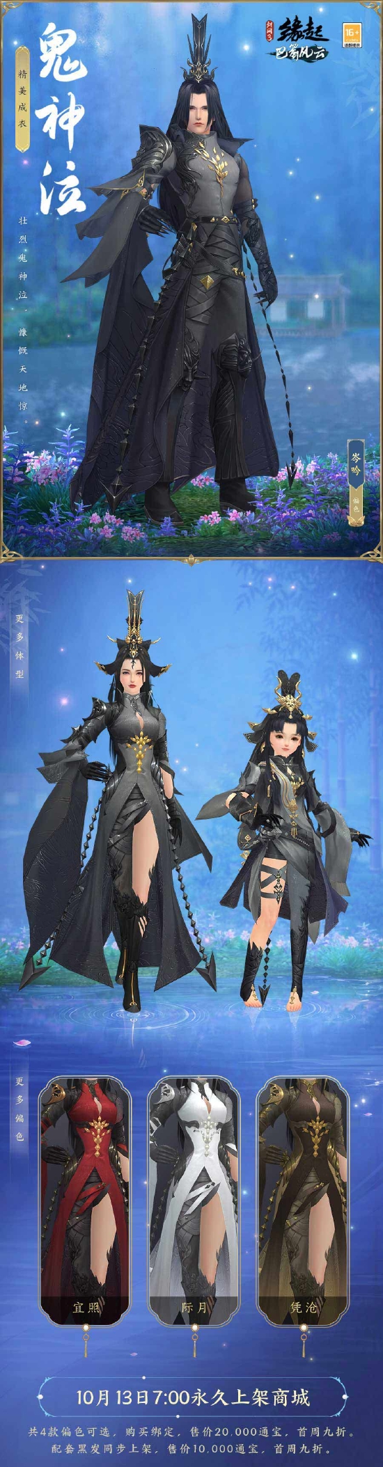 经典成衣[鬼神泣]将于10月13日7:00永久上架商城,共有四款偏色,为绑定款,售价20,000通宝。配套绑定黑发同步上架,售价10,000通宝。首周9折,心仪的侠士可尽快前往商城购买。