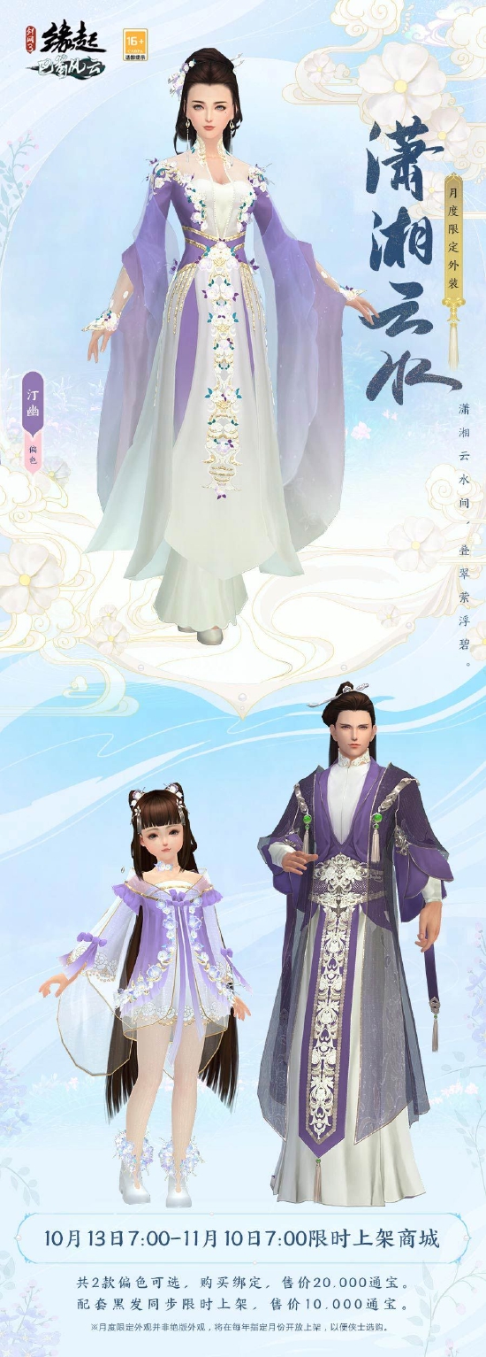 月度限定主题外装[潇湘云水]上架商城,共两款偏色,为绑定款,售价20,000通宝。将于10月13日7:00-11月10日7:00限时上架。配套绑定黑发同步上架,售价10,000通宝。