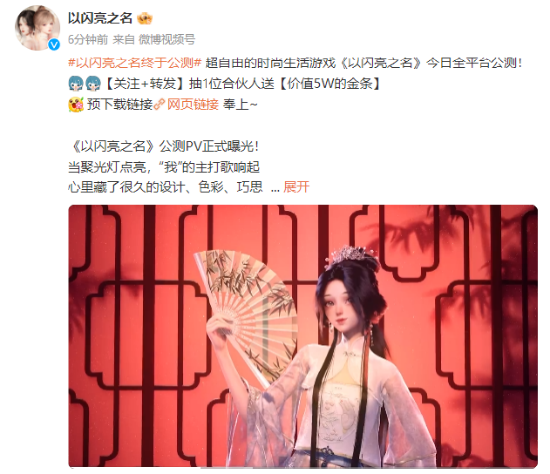 为了庆祝公测,鼓励玩家创作,《以闪亮之名》在微博、微信游戏圈、小红书、抖音、B站、TapTap、九游七大平台开启全民创作大赛,寻找有趣而热爱闪亮世界的创作者。捏脸、COS、家园、趣味视频、穿搭、染色等创作方向不限,图片视频形式不限,脑洞越大越有机会获奖哦~活动详情可前往《以闪亮之名》官方社媒获取。