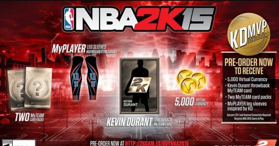 2K Sports日前公布了《NBA 2K15》预订特典,其中以凯文杜兰特为主要合作伙伴,附送其专属的周边产品。