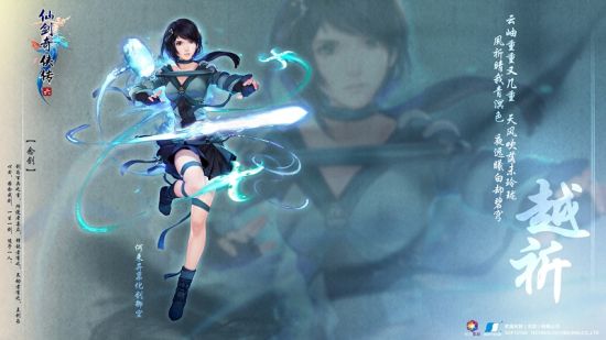 “越祈”干练短发的形象在历代仙剑中较为少见,清澈的深绿色眼眸映着白皙的皮肤,面容清新的女主“越祈”似有异禀,可凌空御物,图中“越祈”并未出现指定武器,而她身旁无数蓝光环绕,似乎不单单是一种武器, “越祈”的专属技能十分神秘。历代仙剑人物中的武器多为实物,而“念剑”,顾名思义:因念成剑。一生一剑,造予一人。这在以往的仙剑主角中还是第一次出现,可见此次女主“越祈”确实与众不同,深不可测。想必“越祈”在《仙剑奇侠传6》的游戏中定会有出色表现,给玩家带来惊喜。