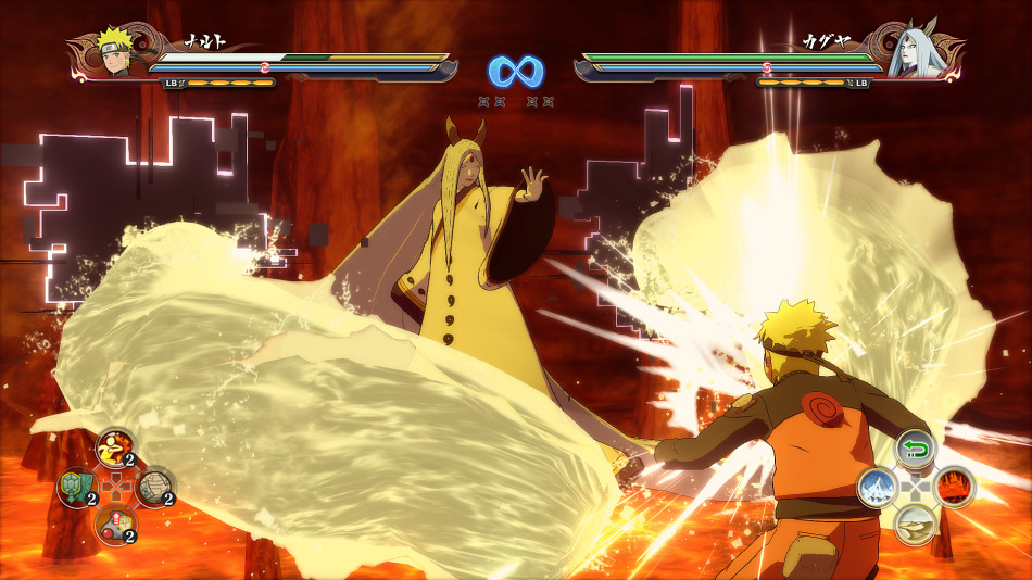 而作为系列大反派,“十尾正体”(查克拉之祖)——大筒木辉夜已经登场,她与后代六道模式宇智波斑、宇智波带土将共同向和平忍界发起挑战,而第七班成员将使用各自最高奥义反抗这场不义之战。目前游戏中可使用的技能包括完全体须佐能乎、无限月读、联合奥义等。