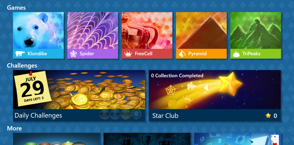 《纸牌》这次以合集的形式内置在了Win10系统中。具体包括纸牌,蜘蛛纸牌,空当接龙,金字塔和远古纸牌五种。同时还新增了不少新功能和特色,例如日常任务挑战,成就等等,同时微软还宣称未来还会有更多的纸牌主题加入。