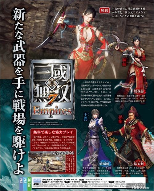 KOEI TECMO预定于11月20日发售的PS3/PS4/XBOXONE多平台游戏《真三国无双7:帝国》本周FAMI通杂志新情报,部分武将的得意武器变更,另外还有联网协力游玩及初回特典介绍。
