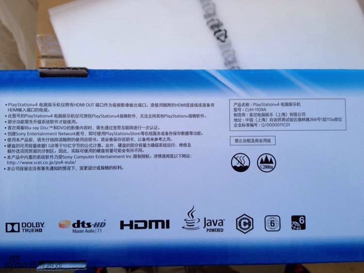 有网友在网络上发布了数张疑为国行版PS4主机包装盒的图片,整体风格和全球一致。标注为“PlayStation 4电脑娱乐机”,型号为CUH-1109A。