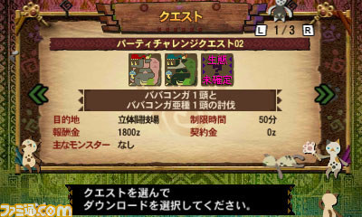 桃毛兽与绿毛兽登场。由于生态环境未确定所以该任务要面对狂龙化怪物。该任务可以活用新系统“抗龙石”。另外,也可以使用立体斗技场中的击龙枪。