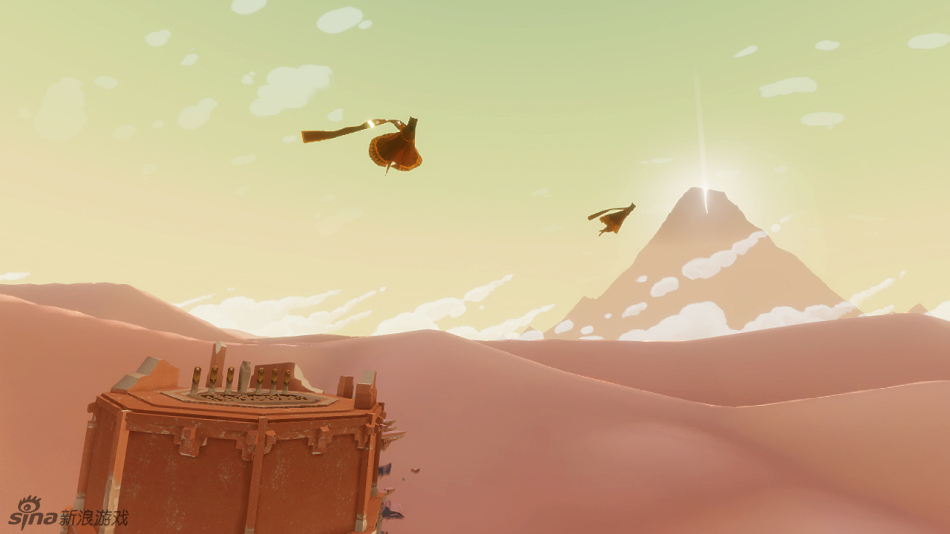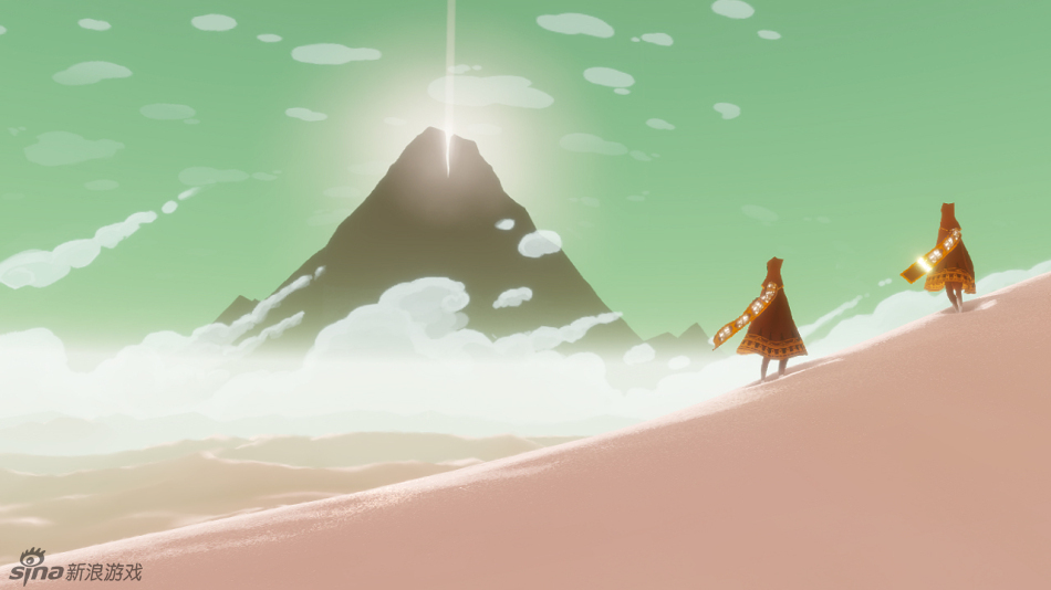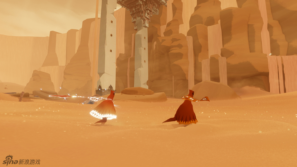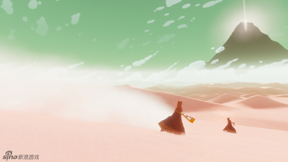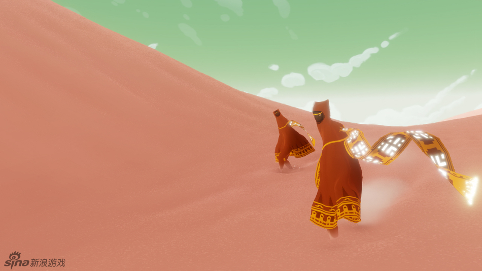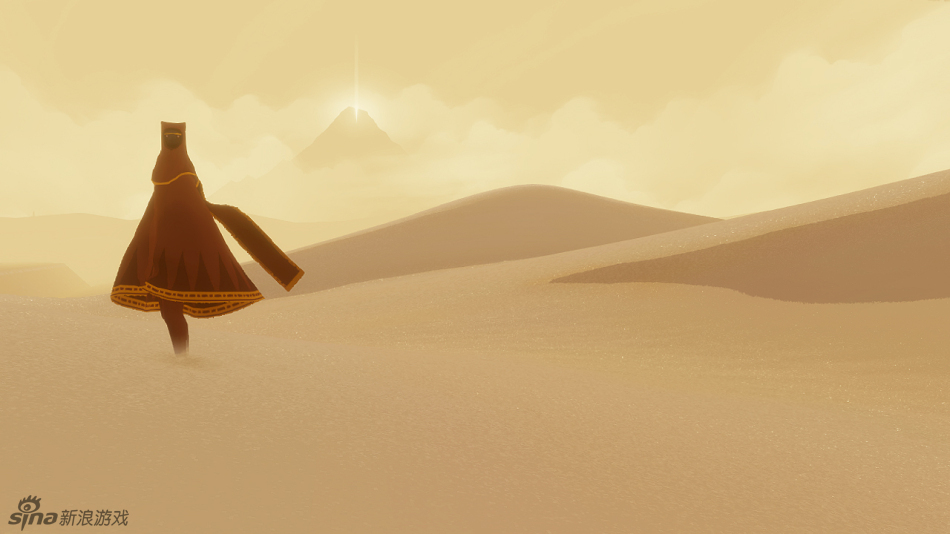 在最初,《Journey》采用的是自上而下的模型设计,玩家们都用小圆点来表示。在游戏中玩家们唯一的沟通交流就是可以大喊一声“Hey”,游戏中唯一的声音就是风声。