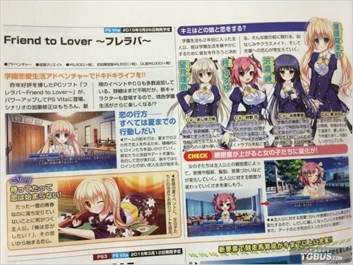 在本周的电击PS杂志上,加賀クリエイト公开了PSV新作《朋友之恋》( Friend to Lover フレラバ),预定于2015年3月26日发售。这是一款移植自PC平台同名作品的美少女恋爱游戏,PSV版将会增加新的角色、新的剧情以及大量新插图。其中新剧情方面可以确认的有夏季和穿着浴衣的女孩子们约会的情节。
