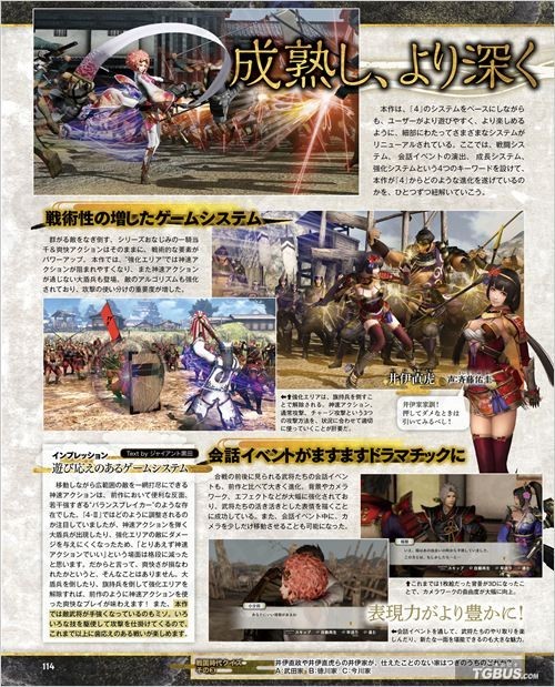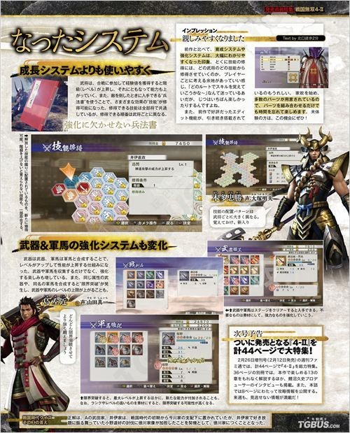 战国无双4-2另外还介绍了战术性增加的游戏系统,以及会话剧情,成长系统也更容易上手,武器及军马的强化系统也有变化,将作为素材的武器或军马合成后可增加经验值,提升等级或攻击力、附加能力值等,有着同样属性的武器或同名军马合成的话就会发生“限界突破”,提升最大等级,并增加新能力。