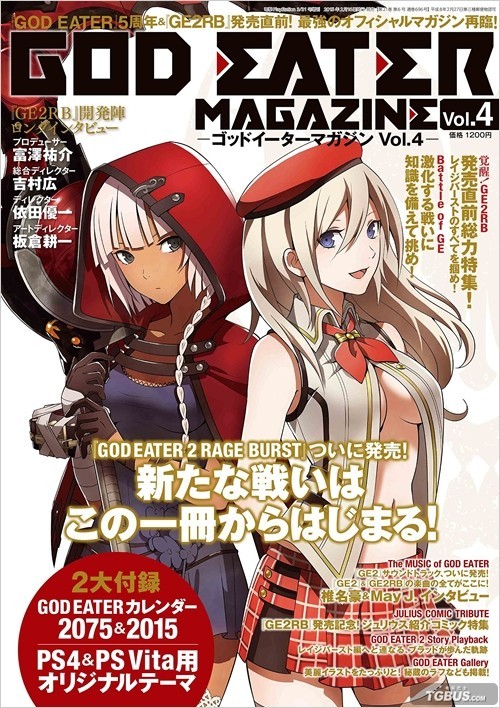 预定2015年2月16日发售《噬神者》专门志“《God Eater magazine Vol.4》”日前公开了封面图及内容介绍,杂志收录了系列最新作《噬神者2:狂怒解放》的售前总力特集、游戏制作人访谈、乐曲制作担当椎名豪及ED曲演唱者May J。访谈等丰富内容,杂志还附赠《噬神者》2075&2015年日历,以及PS4&PSV用主题下载码,没有买限定刻印机也想要主题的玩家不要错过。