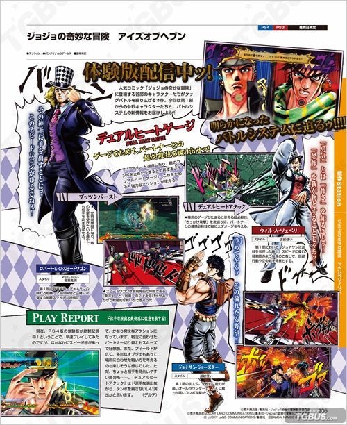 Bandai Namco推出的PS4/PS3《乔乔奇妙冒险:天堂之眼》为原作漫画改编的动作游戏最新作,之前官方已公布来自第一部《幻影之血》角色乔纳森·乔斯达、威尔·A ·谢皮利、罗伯特·E·O·史比特瓦根参战且均为可用角色,本周电击杂志公开这几位角色详情。