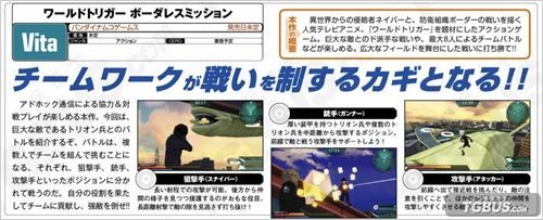 BANDAI NAMCO预定在PSV平台推出的动漫改编游戏《境界触发者 无界任务》在本周的Fami通杂志中公开了一些新情报。游戏主要乐趣在于通过联机进行协力与对战,而战斗中玩家可以担当的职能有3类:狙击手、枪手、攻击手。