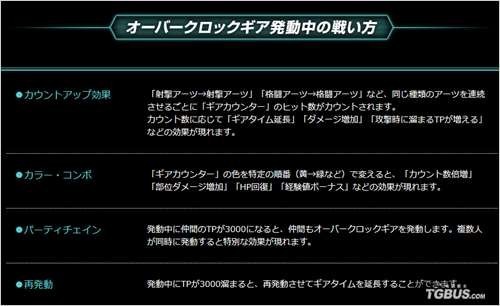再发动:在Over Clock Gear发动期间TP再度积累至3000点时,玩家们可以利用再发动来延长Gear时间。