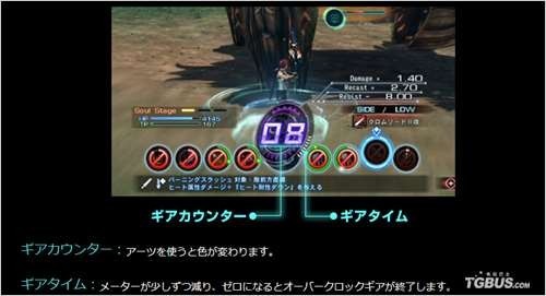 计数上升效果:连续使用射击技能或连续使用格斗技能,利用这种连续使用同类型技能的方式可以使“Gear计数器”所记录的Hit数提升。而随着计数的提升,“Gear时间延长”、“伤害增加”、“攻击时积累TP值增加”等效果也会随之出现。