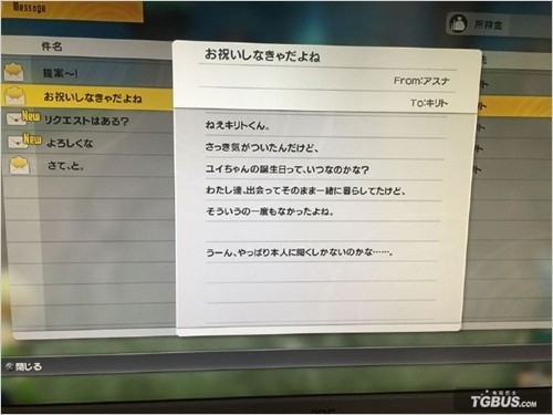 刀剑神域 失落之歌游戏中女主角还会给桐人发送一些邮件。比如: