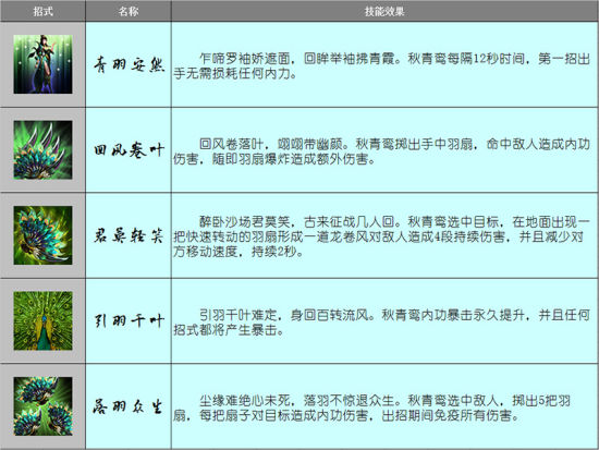 秋青鸾生平绝学 秋青鸾笑眼盈盈,美艳脱俗,待人和善。虽武艺非凡,与之交手之辈却无一人送命,即便对手是大奸大恶之徒,秋青鸾也网开一面。秋青鸾天赋为青羽安然,生平绝学回风卷叶、君莫轻笑、引羽千叶、落羽众生。