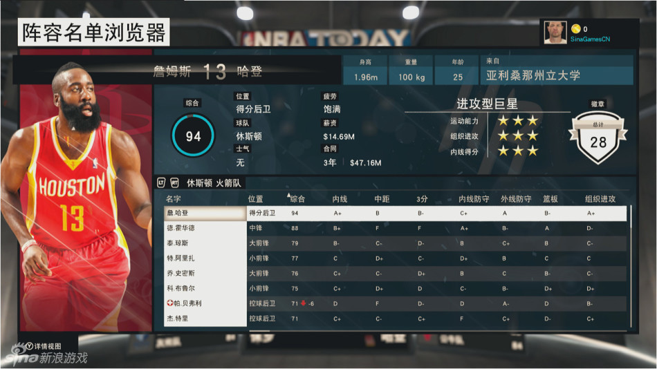 “火箭队”的西决名单与现实如出一辙并且,能够像国行XB1版《2K15》将本土化工作做到如此“极致”的游戏也是非常的少见。除了界面以及菜单之外,甚至连大家耳熟能详的球员名单都完全翻译,可部分球员却又选用了不常用的汉子,反倒让已经熟悉了英文球员名的老玩家感到不习惯。