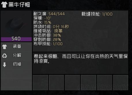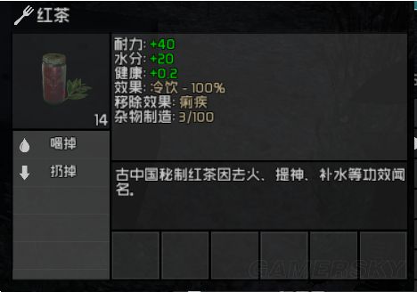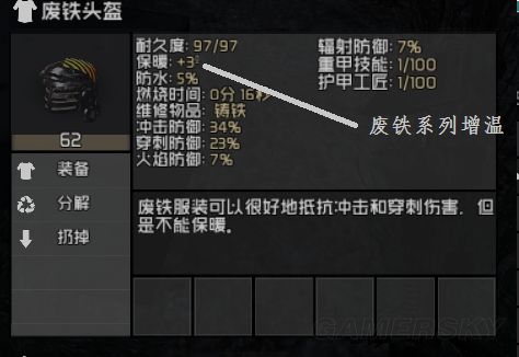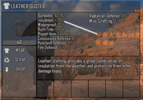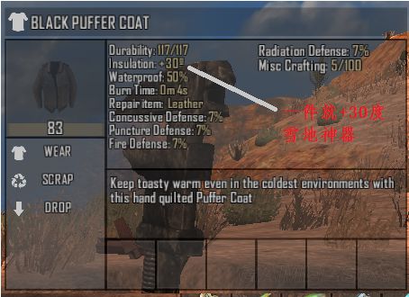 2、降温物品,牛仔帽(可制作)、面罩(可制作)、眼镜,所有铁制防具,包括防弹头盔、钢盔等(一 套铁防具共5件可降温35度),但是铁防具不包括废铁防具。两种饮料也可降温,红茶与丝兰果汁,持 续0.2小时,降10度,(饮料降温左下角会有一个茶壶标志)。