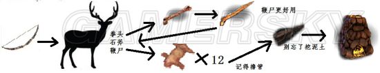 一把弓、杀任意一只动物(敲动物尸体出骨头做刀)、杀动物用刀解尸体出12张皮、出熔炉;