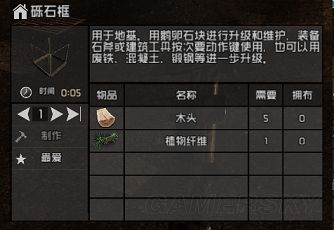 材料:1木框架需要10木制作,1砾石框需5木1纤维(纤维本作为刷工具、防具必备物品)。